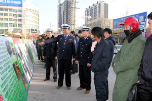 该中队全体民警在“百日会战”中,积极开展交通安全宣传活动,营造浓厚交通安全氛围。12月24日,该中队民警在民乐园广场向过往群众展出今年该县境内发生的重大交通事故展版20多块、散发宣传资料2000余份,现场向广大市民讲解道路交通安全法,分析事故发生的原因及危害后果,教育广大人民群众要引以为鉴,吸取教训,遵守交通法规。提醒广大人民群众:应汲取经验教训,从自我做起,遵守法规,摒弃陋习,文明行车,文明乘车,文明走路,以实际行动参与到冬季交通秩序整治“百日会战”和“文明交通行动计划”活动中来。