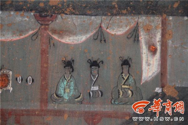 壁画上绘有墓主人宴乐场景图。上面宾客东西向对坐,各有三人,身前置红色漆盘。“漆盘一人一只,每一道菜每位客人一份,由侍者分送到每位客人面前。”段毅介绍,壁画正中的俩舞者正在对舞,而宾客皆作拍手称赞状,这种歌舞相悦的家宴场景只有在有一定等级的人家才能看到。