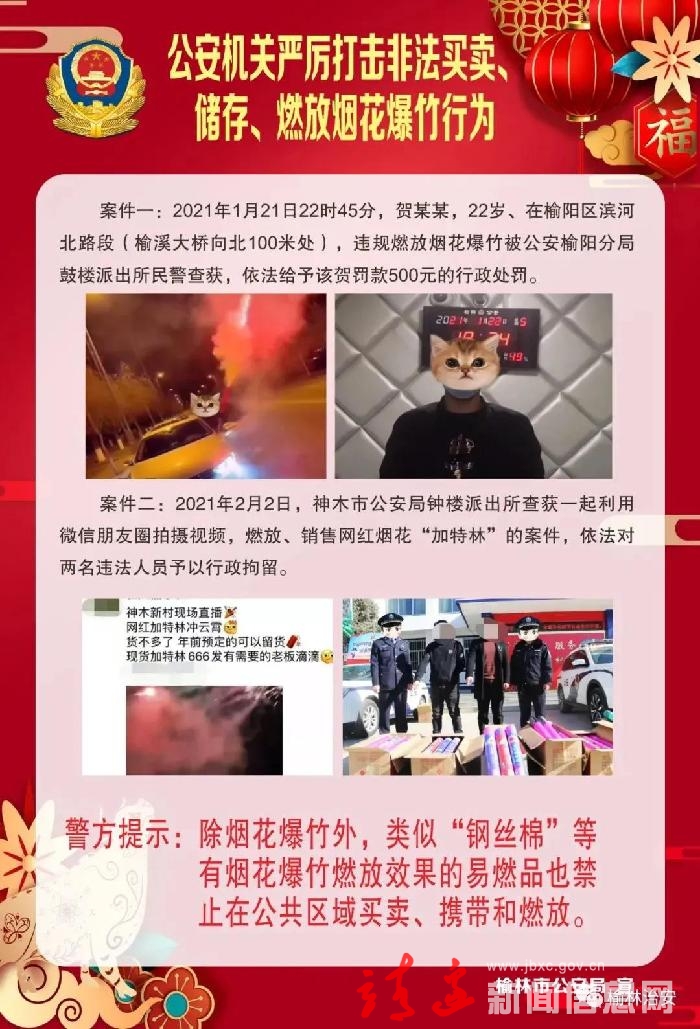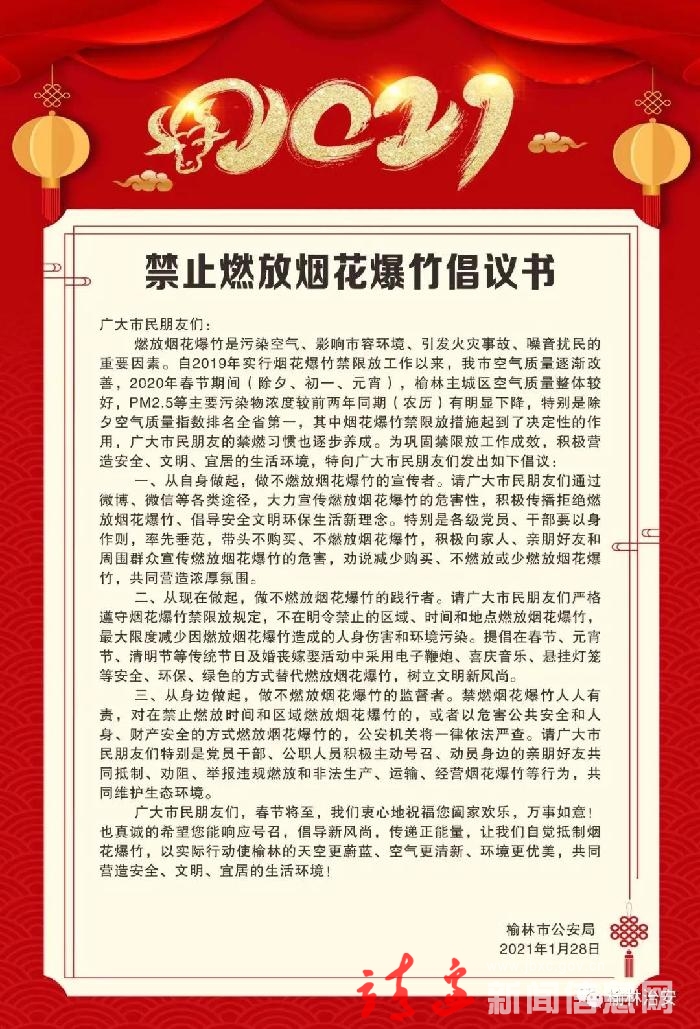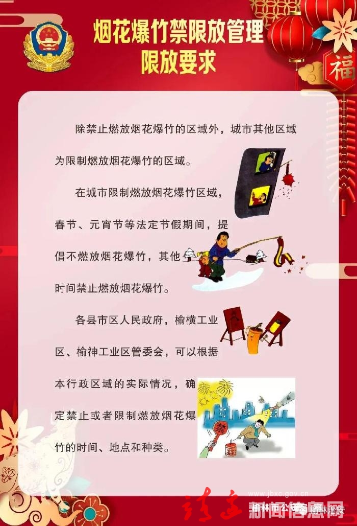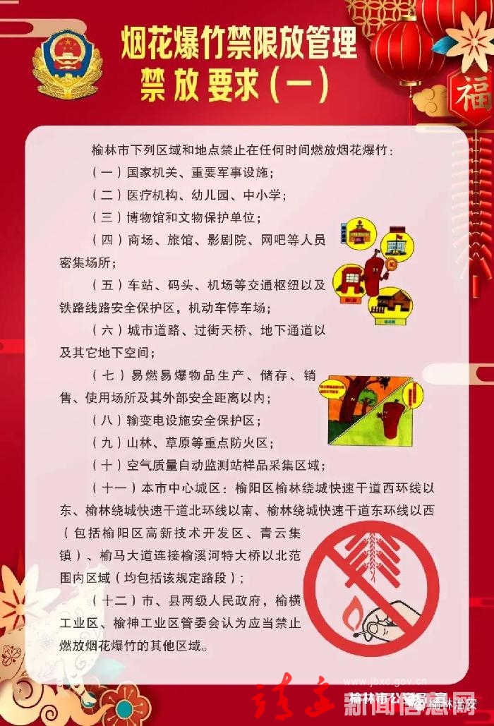 为了加强烟花爆竹燃放安全管理,进一步改善市容环境卫生,减少城区噪声污染,防止火灾、炸伤、烧伤等重大事故的发生,保障人民群众生命财产安全,根据《中华人民共和国环境保护法》《烟花爆竹安全管理条例》《陕西省烟花爆竹燃放安全管理规定》《榆林市烟花爆竹燃放安全管理办法》等相关法律法规规定,现将靖边县禁限放烟花爆竹有关事项通告如下: