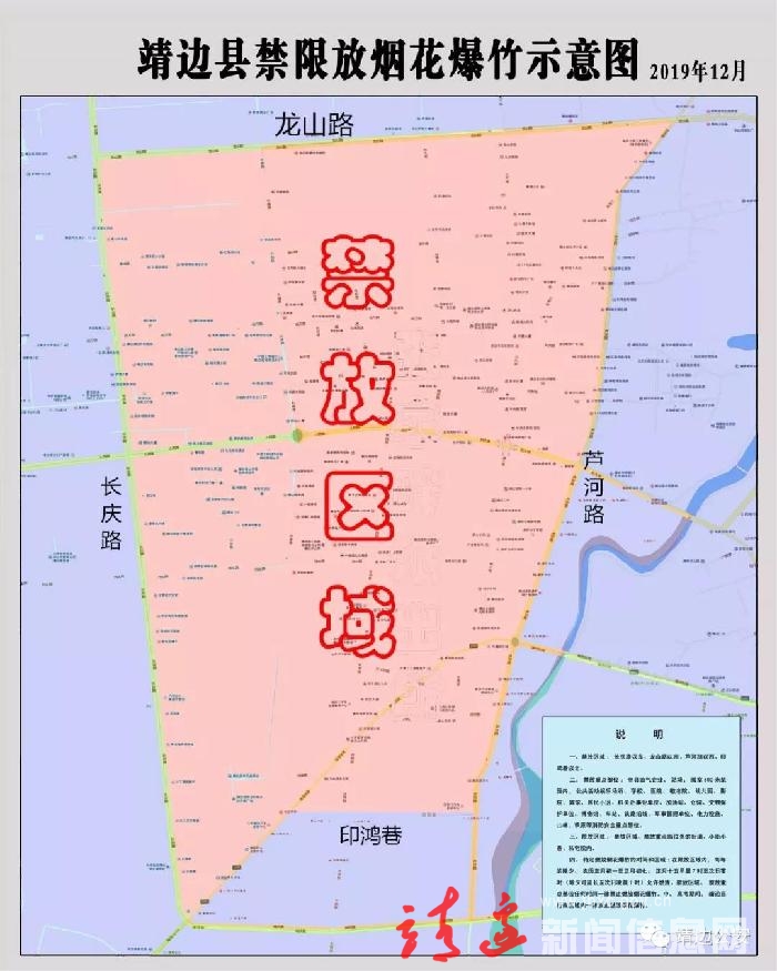 (一)禁放区域:长庆路以东、龙山路以南、芦河路以西、印鸿巷以北。禁放重点部位:全县油气企业、站场、阀室500米范围内,公共活动娱乐场所、学校、医院、敬老院、幼儿园、影院、宾馆、居民小区、机关企事业单位、加油站、仓储、文物保护单位、博物馆、车站、铁路沿线、军事管理单位、电力设施、山林、草原等消防安全重点部位。 (二)限放区域:本通告适用范围内除禁放区域、禁放重点部位外的街道、小街小巷、私宅院内。在限放区域内,每年的除夕、农历正月初一至正月初七、正月十五早晨7时至次日零时(除夕可延长至次日凌晨1时)允许燃放。禁放区域、禁放重点部位任何时间一律禁止燃放烟花爆竹。中、高考期间,靖边县行政区域内一律禁止燃放烟花爆竹。所有烟花爆竹均在禁止燃放之列,即大炮、小炮、烟花、礼花、拉炮、冲天炮、火箭炮、火柴炮等。五、举办焰火晚会以及其他大型焰火燃放活动,主办单位需向公安机关申请《烟火燃放许可证》,并按照公安机关批准方案施行;未取得《焰火燃放许可证》的,不得举办焰火晚会以及其他大型焰火燃放活动。六、对未经许可举办焰火晚会以及其他大型焰火燃放活动,或者违反焰火燃放安全规程、燃放作业方案的,依照国务院《烟花爆竹安全管理条例》第四十二条第一款之规定,由公安机关责令停止燃放,对责任单位处1万元至5万元的罚款。对在禁止燃放烟花爆竹的时间、地点燃放烟花爆竹者,依照国务院《烟花爆竹安全管理条例》第四十二条第二款之规定,由公安机关责令停止燃放,处100元以上500元以下的罚款。对阻碍、妨碍执行公务的,由公安机关依法予以治安管理处罚;情节严重,构成犯罪的,依法追究刑事责任。七、对违反本通告燃放烟花爆竹的单位和个人,除给予处罚、进行电视曝光外,作为该单位年度综治考评的重要依据。涉及国家公职人员的,除给予处罚外,还将按照党纪政纪规定予以追责。各级党政机关不得以任何形式组织燃放烟花爆竹,同时倡导各级党政领导干部及家属带头拒绝燃放烟花爆竹。