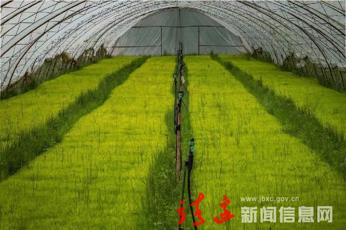 时序小满,走进素有“塞上小江南”之美誉的靖边县黄蒿界镇马季沟村,一个个水稻育苗大棚鳞次栉比,其间一株株幼苗生机盎然、长势喜人,稻农们正忙着出苗。在育苗棚不远处,一块块整理平整、泛着粼粼波光的稻田,在两边青翠山林的映衬下美如画卷。眼下正值陕北黄土高原水稻插秧时节,农民们抢抓农时,利用机械进行水稻插秧。插秧机在稻田里来回穿梭,一派繁忙景象。