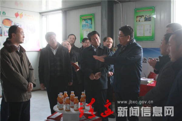 在“陕北红”沙棘保健食品有限公司,刘维平向高寒(左一)详细介绍政府为入驻企业所做的服务工作