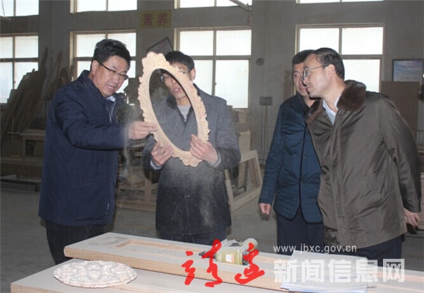 在三友木业生产厂房,企业负责人为刘维平和高寒详细介绍家装木门木制花纹的刻制工序