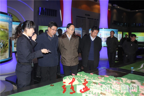 在能化园区展览馆,刘维平陪同高寒一边观看园区规划模型一边听取工作人员情况介绍