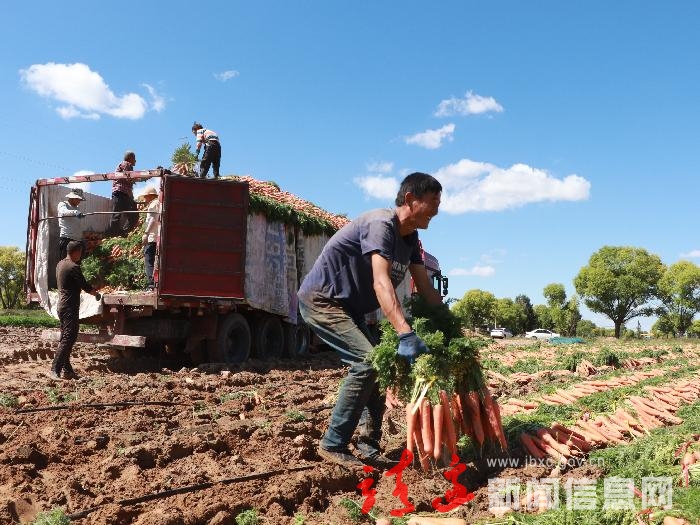 8月21日拍摄的靖边县镇靖镇芦西村胡萝卜收获现场。村民们正在将胡萝卜装车,准备销往北京、重庆、河南等地。