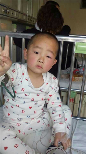 正在做痛苦治疗的小湘岳摆成V形的胜利手势,相信自己在社会中的爱心叔叔、阿姨的帮助下一定能战胜病魔