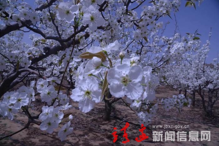 “冷艳全欺雪,余香乍入衣。”步入梨园,朵朵梨花或含苞待放,或迎风盛开,一团团、一簇簇,暗香浮动,争奇斗艳。微风拂过,雪白的花瓣纷纷扬扬散落满地,阵阵花香芬芳扑鼻,丝丝清香浸入心田,令人陶醉。似云胜雪的梨花演绎着春天的美丽与生机,将小家碧玉的美融入雄魂的大美丹霞之中,浑然天成,美艳绝伦。