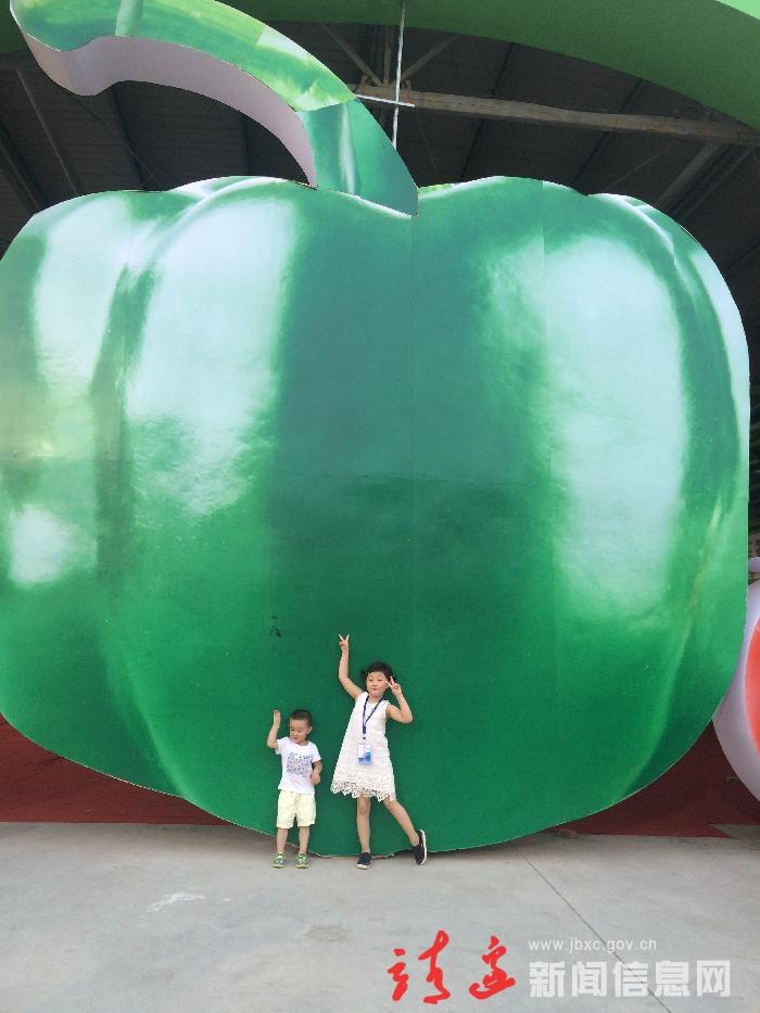 本网迅( 曹晔)8月17日,在靖边蔬菜节的主展区,两名参展的小朋友被妙趣横生的会场布置所吸引,争相与超级大的辣椒合影留念。