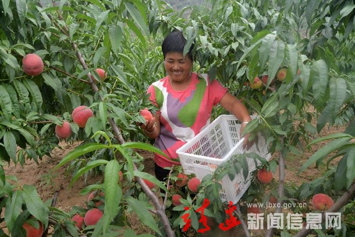 青阳岔镇高石崖村“老马鲜桃”基地内郁郁葱葱,一早上,青阳岔镇高石崖村57岁闫巨康和妻子在自家的桃园采摘鲜桃,“早上接到合作社电话,要把成熟的桃子全部采摘下送到合作社来”,闫巨康边摘桃子,边对笔者说到。