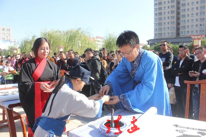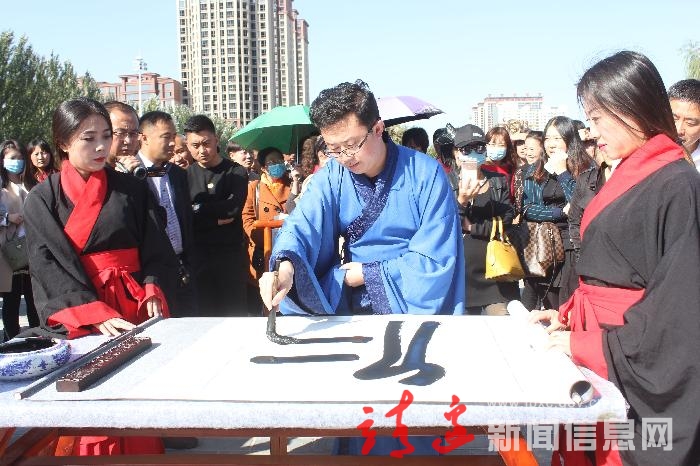 活动中,书法老师现场书写了“仁”、“义”、“礼”、“智”四个大字赠与学子。学子代表向恩师奉茶,千名学生向老师行了拜师礼。