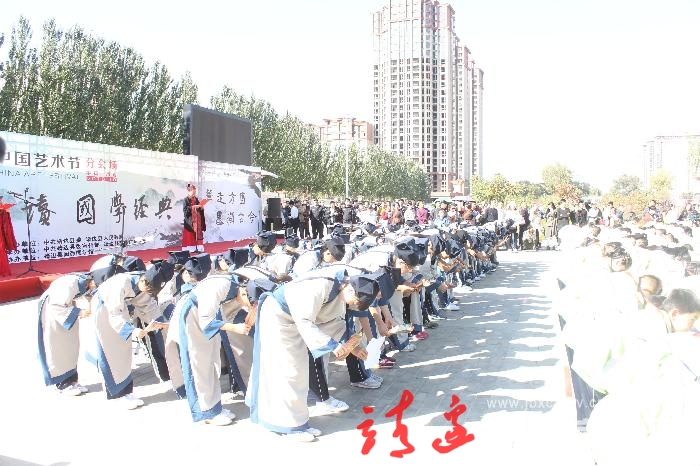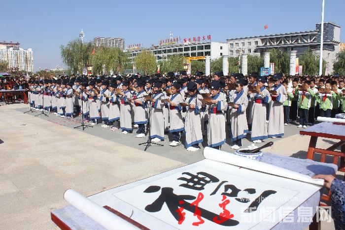 本网讯(白凌燕)“人有三尊,君、亲、师。师者,传道受业解惑也,然而君、父但有学识德馨,则必有师。”10月18日,第十一届中国艺术节靖边分会场千人诵读国学经典活动在县综合文化广场举行。千名小学生与在场家长们在赞礼的引导下集体吟诵弟子规《总叙》、《入则学》、《出则悌》、《信》、《泛爱众》、《余力学文》等国学名篇,场面蔚为壮观,震撼心灵,吸引了不少市民驻足、观看、聆听、吟诵。