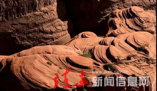 登高望去,红色砂岩石宛如彩云追月,七彩缤纷,绰约多姿,红色、赭红色相间的图纹,鬼斧神工般刻于沟边、峁上、山巅、河岸,一条条、一片片、一圈圈、一点点,花纹酷似波浪,形态颇拟万物之状。不同角度望去,如峡谷瀑布,如一线天堑,如祥龟望海,如情人对诉,如凤凰展翅,如芙蓉出水,如金鸡独立,如猛虎下山。还有闫寨石窟,凿于悬崖峭壁,平添几多历史的厚重、沧桑,似乎昭示着曾经发生的故事的神秘,生活的奇幻色彩……