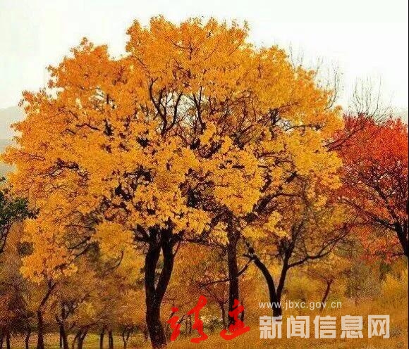 靖边 “丹林”,与香山红叶不同,这里树种繁多,灌乔同地,疏密相间,桃树、杏树、枫树、杜梨树、火炬树、山楂树红色叶子交织,点缀在山岇坡洼,河边沟中,房前屋后,脑畔硷畔……最夺眼的是山楂树,果赤叶丹,在阳光下明媚灿灿;金黄色的杜梨果挂满枝头,在红色的叶子映衬下,亮人眼球,引人注目,令人心旷神怡,顿生诗情画意。陪衬黄色、绿色的树叶,与蓝天交相辉映,以“丹霞”相伴,美丽旖旎。