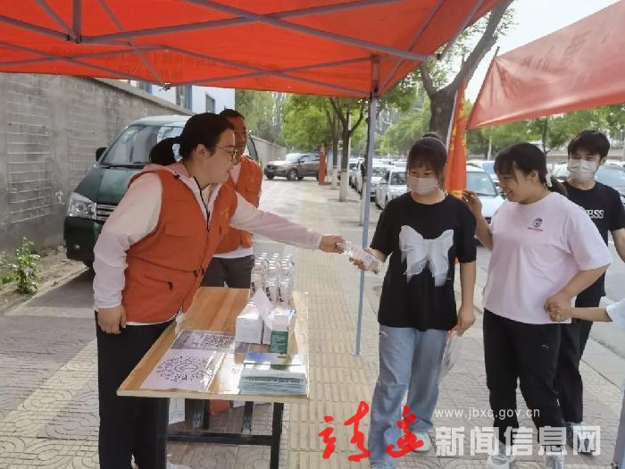 志愿者们在靖边中学设立高考志愿服务站,给考生以及家长们免费提供饮用水、口罩、凳子、藿香正气水、创可贴等物品,为高考考生和家长提供健康保障服务,并提供现场引导、爱心赠饮、文明劝导、协助交警维持考场周围秩序等志愿服务。