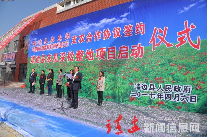 本网讯(郭旭)4月6日,在全省放心农资下乡进村活动暨靖边县首届农用物资展销会上,邮政储蓄银行靖边支行与我县签约支农协议,同时启动靖边县农机深松整地项目。市农机服务中心主任康锦宏,邮政储蓄银行榆林分行党委书记、行长高维德,县长贺湘如,县委常委、政法委书记胡荣芳,县人大常委会副主任谢红静,县政协副主席刘宝玉出席了仪式,仪式由副县长赵少毅主持。