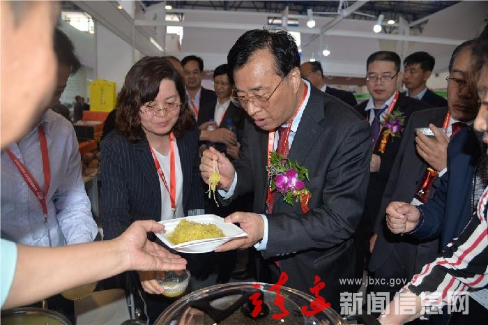 4月22日,原农科院院长、中央后补委员、中国农业国际合作促进会会长翟虎渠,农业部外经中心原副主任、中国农业国际合作促进会副会长周启疆、市政府副市长张海峰被我县美观独特的布展所吸引,莅临我县农产品展馆参观指导。在县长贺湘如,副县长赵少毅,县政府办、农业局、东坑、宁条梁、黄蒿界等农业重镇以及北京靖边商会负责人的陪同下,周启疆一行逐一查看了我县参展的36种农产品,并亲自品尝了现场制作的荞麦饸烙和香气四溢的靖边羊肉,翟虎渠高兴地竖起了大拇指,连连称赞“不错!不错!”