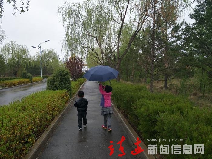 5.1当天,五台森林公园细雨蒙蒙,小游客撑伞游览公园美景