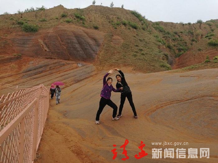 游客在龙洲丹霞景区拍照留念