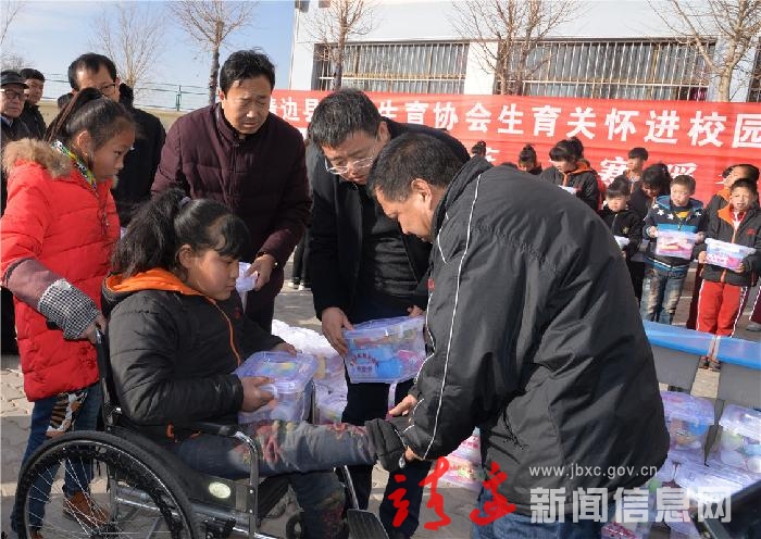 活动中,刘钧与县计生协会、县残联、靖边县特殊教育学校负责人分别为179名孩子发放了装有毛巾、洗发水、洗衣液等生活用品的爱心大礼包。