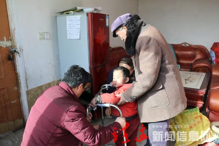 在东胜村脑瘫患者殷子豪家里,王武亲自为小朋友换上带来的行走支架,并送上了慰问品和慰问金。看到小朋友在支架的帮助下向前走来,王武鼓励他慢慢来,并叮嘱家人要小心照看,早日恢复。