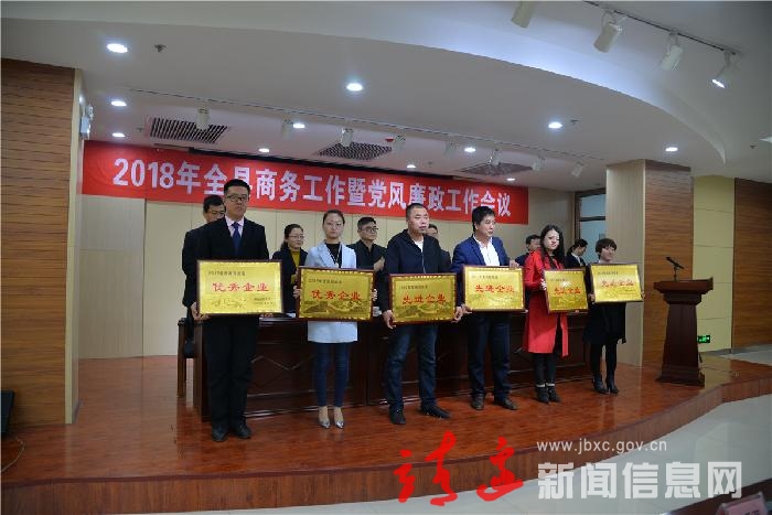 会议还表彰奖励了杨涛、王尧等5名2017年度商务先进工作者,靖边县志红金属贸易有限公司、靖边县永嘉商贸有限公司等6个2017年度商贸流通先进企业,和靖边县春夏秋冬大酒店、靖边县紫靖餐饮管理有限公司等8个2017年度商贸服务先进企业。