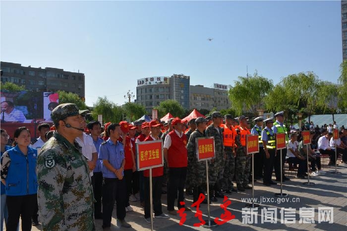 7月17日,我县在政府综合文化广场举行2018年防汛联合演练。县防汛抗旱指挥部副总指挥、县委常委、政法委书记胡荣芳,县委常委、人武部政委郭兵,指挥部成员单位主要负责人以及其他各部门、各乡镇(场)、街道办主要领导和分管领导观摩演练。