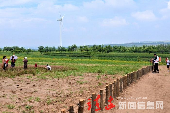 日前,几名游客正在靖边县王渠则镇设施农业休闲观光区摄影留念。正值初秋时节,漫山遍野的花开盛景与身后一望无际的风车带相映成辉,别具风情。