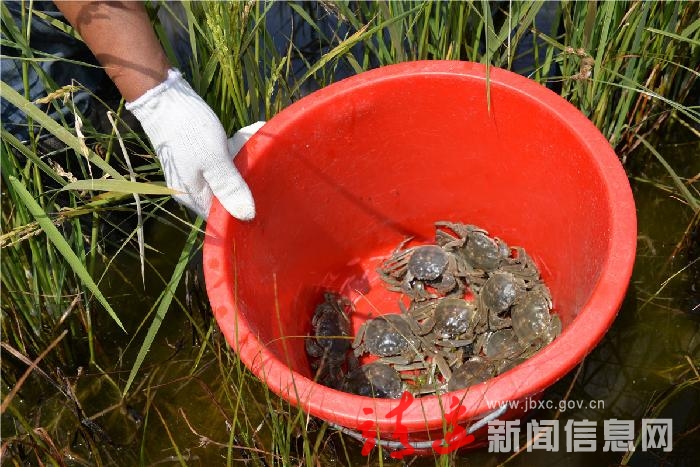 “稻蟹共生种养,能够净化水质,增加水中溶氧,为幼蟹提供脱壳和隐蔽的安全栖息场所,夏季能降低蟹塘水温,有利于幼蟹增加脱壳次数,使蟹个体大而均匀,肉质鲜嫩营养价值高。稻株上的害虫如稻飞虱等还可以为幼蟹提供天然饵料,可充分利用蟹塘中的生物链,使稻蟹共生,达到水稻、蟹双丰收的目的。”技术员徐国平向记者科普了稻蟹共养的妙处。“水稻全生育期基本上不使用农药,化肥用量也明显减少,控制了面源污染,提高了农产品的质量。稻蟹共生种养是推广有机稻米生产的一种有效的种养模式。”