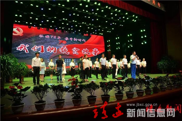 活动在《我和我的祖国》音乐声中开场,邬晓君带领全县的宣传团队走上舞台,讲述扶贫路上发生在他们身边的感人故事。