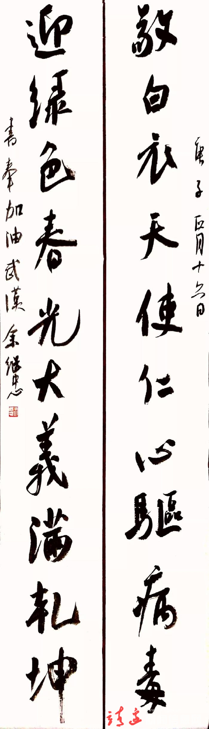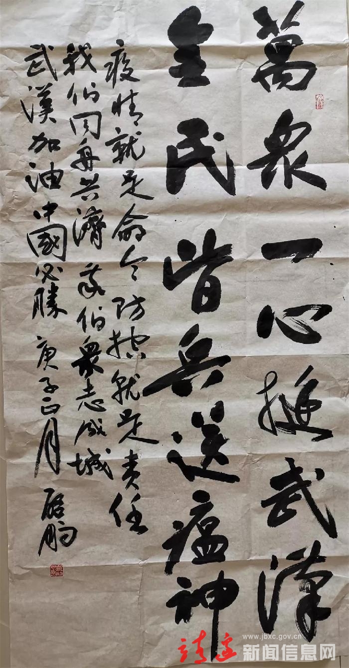 本次活动得到社会各界高度重视和大力支持,靖边县县委书记刘维平、县人大常委会主任白春阳、县委常委、统战部长高正刚等也积极参与,赋诗题联,带头创作。几天来,我们收到以诗歌、书法、绘画、摄影、剪纸等形式的艺术作品二百一十余件。尽管不少作者因隔离在家,书写的条件极差,更无从谈装裱。但这些作品主题鲜明,包含深情,或祈福平安,或宣讲防疫,或讴歌英雄,传递人间大爱,弘扬时代精神,为武汉加油,为湖北加油,为抗击疫情呐喊助威。
