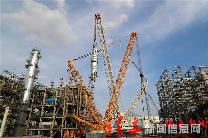 “此次吊装的合成塔是进口核心设备之一,高达21米。整个吊装作业过程历时约一个半小时,期间完成了穿插吊装孔、水平调整以及方位对正等一系列高难度操作。”现场施工技术人员介绍道。