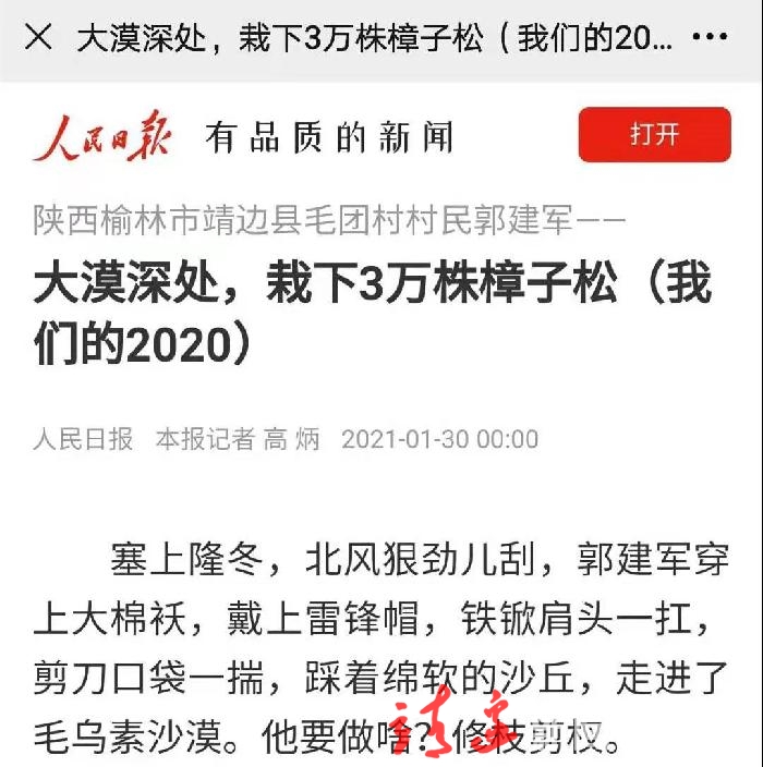 2020年,凭着这股子韧劲儿,他一口气在大漠里新栽了3万株樟子松。