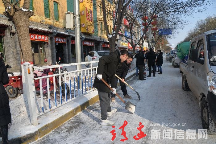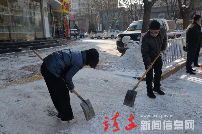 在城区的路段,处处可见扫雪铲雪的忙碌景象,各单位工作人员,拿起铁锨、扫帚清扫积雪积冰,在大家的共同努力下,城区街道、人流车流集中的道路、区域积雪很快被清扫干净,确保了道路畅通安全。