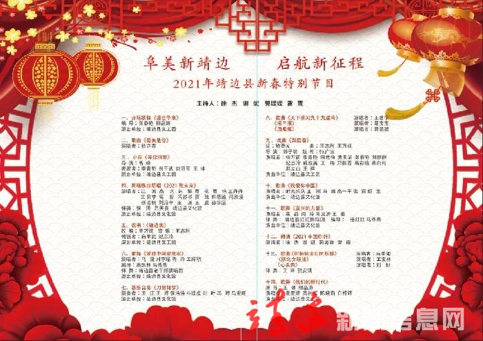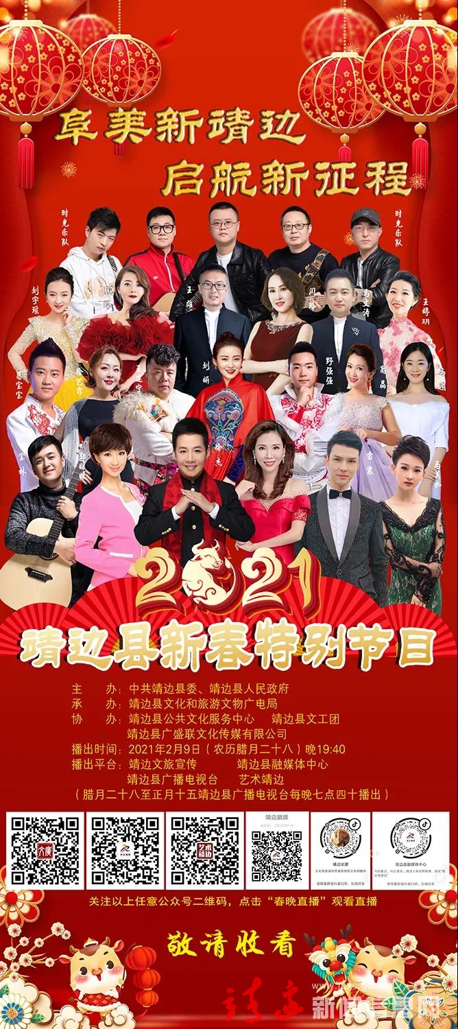 2021年2月9日(农历腊月二十八)19时40分,靖边县新春特别节目将通过靖边文旅宣传、靖边县融媒体中心、靖边县广播电视台、艺术靖边等微信公众平台进行全网首播,腊月二十八至正月十五靖边广播电视台每晚19时40分播出,欢迎各位的收看,也欢迎大家点击关注留言互动。