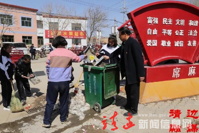 近日,席麻湾镇九年制学校学生在校长曹虎宁的带领下,扛着扫帚、铁锹、土盘等清扫工具来到席麻湾镇街道,开展义务清扫活动。