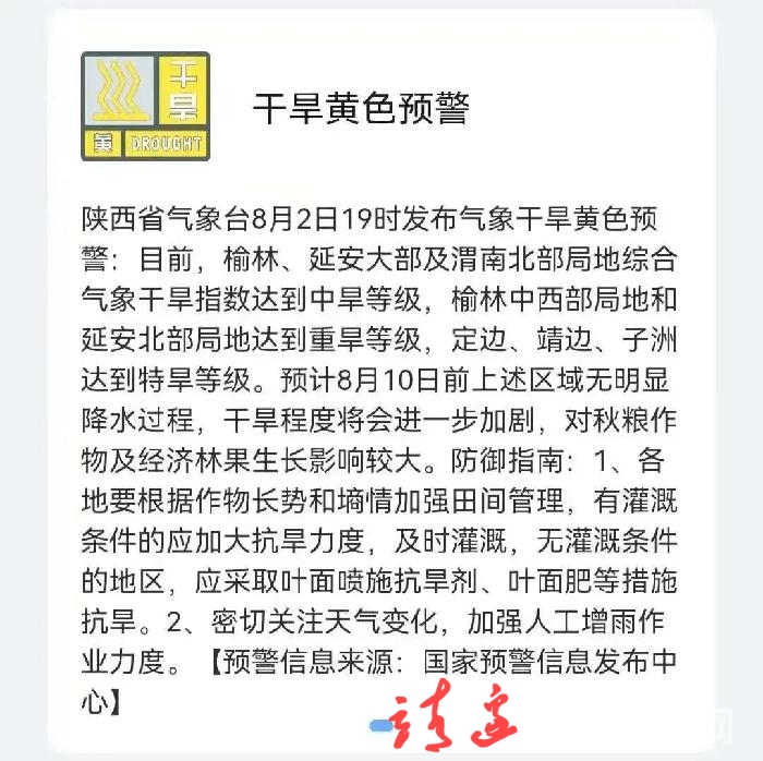 目前,榆林、延安大部及渭南北部局地综合气象干旱指数达到中旱等级,榆林中西部局地和延安北部局地达到重旱等级,定边、靖边、子洲达到特旱等级。预计8月10日前上述区域无明显降水过程,干旱程度将会进一步加剧,对秋粮作物及经济林果生长影响较大。