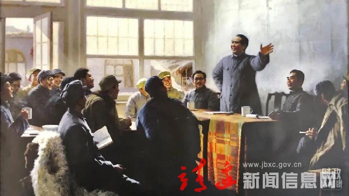 △“十二月会议”场景还原,墙壁上的照片翻拍自画家靳尚谊于1977年创作的布上油画《党的十二月会议》。(总台央广记者刘会民、央视记者许永松拍摄)“度之往事,验之来事,参之平素,可则决之。”今天的中国共产党人,亦当以史为镜,洞察时代大势,把握历史主动,进行艰辛探索,开创属于我们这一代人的历史伟业。