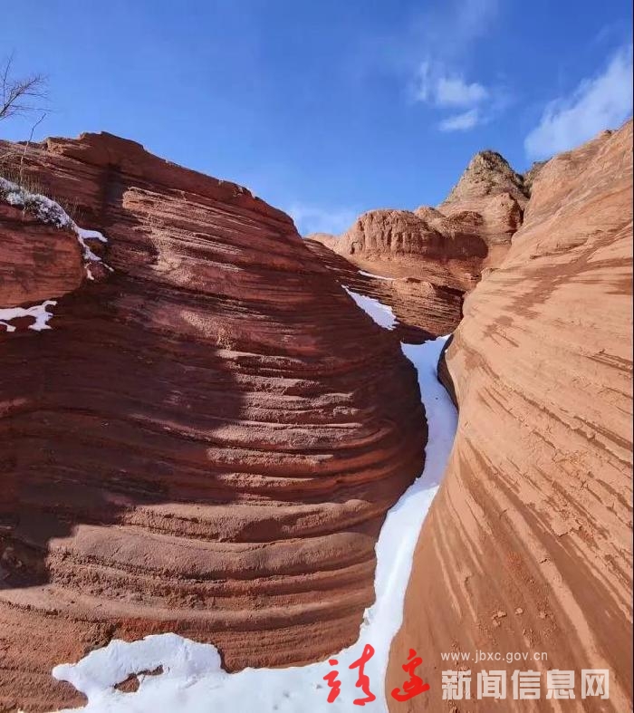 波浪谷景区经过亿万年的风化剥离和流水侵蚀,地下的岩石形成孤立的山峰和陡峭的奇岩怪石,一层层、一浪浪的红砂岩,犹如一道道优美的波浪线,浪漫的初雪与红色的砂岩相互映衬,红白相间之间,北国风光尽现眼前,美得让人心醉。