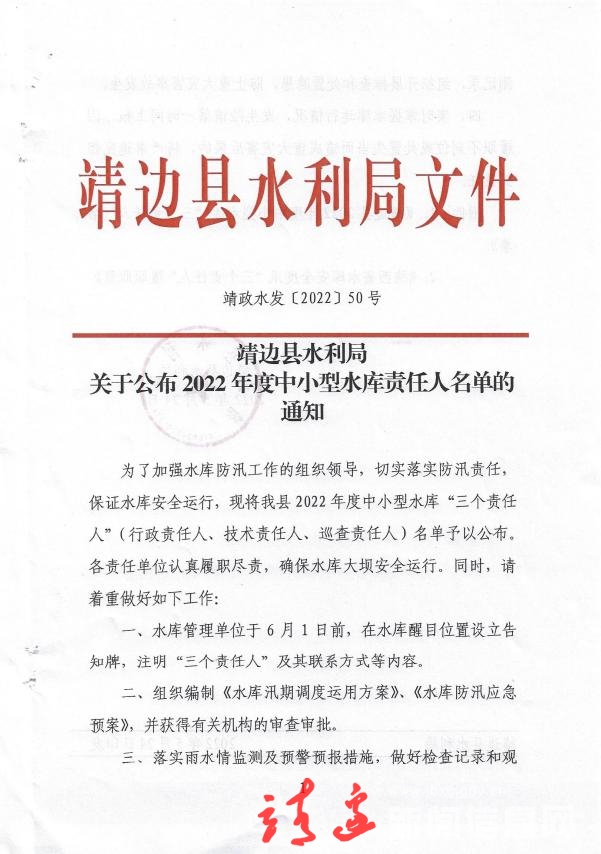 靖边县水利局 关于公布2022年度中小型水库责任人名单的通知