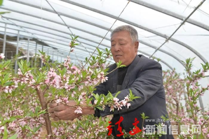 今年五十多岁的毛团村村民米忠诚一边在大棚内吊桃枝,一边查看树苗的长势,他负责种植园的日常管护。“不是花朵越密桃子的产量就越高,要想桃子的品质好,就要掐掉多余的花,才能保证剩余的花骨朵儿吸收到更多的营养,结出好桃子。”米忠诚说:“在这里干活,轻松而且能顾家,一年还有大几千元的收入,老美气了。”