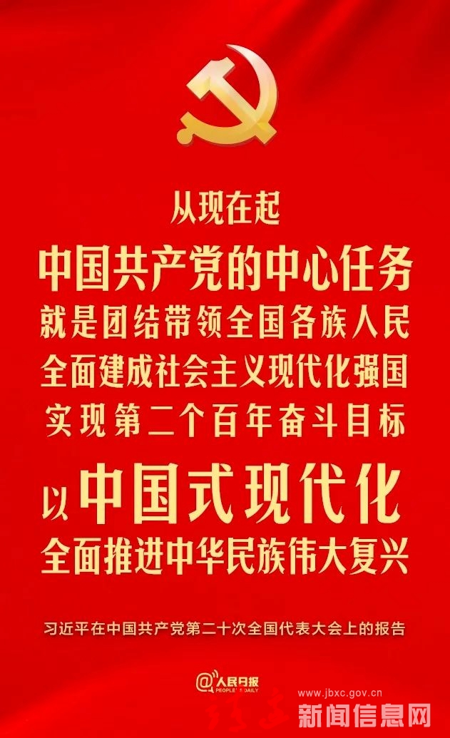 习近平指出,从现在起,中国共产党的中心任务就是团结带领全国各族人民全面建成社会主义现代化强国、实现第二个百年奋斗目标,以中国式现代化全面推进中华民族伟大复兴。