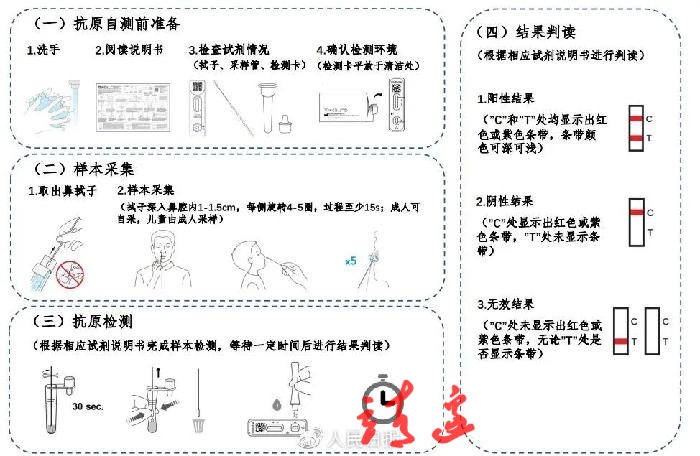 图 抗原自测流程示意图(具体参照特定试剂盒说明书)1.根据试剂说明书,将采集样本后的鼻腔拭子立即置于采样管中,拭子头应在保存液中旋转混匀至少30秒,同时用手隔着采样管外壁挤压拭子头至少5次,确保样本充分洗脱于采样管中。2.用手隔着采样管外壁将拭子头液体挤干后,将拭子弃去。采样管盖盖后,将液体垂直滴入检测卡样本孔中。阳性结果:“C”和“T”处均显示出红色或紫色条带,“T”处条带颜色可深可浅,均为阳性结果。阴性结果:“C”处显示出红色或紫色条带,“T”处未显示条带。无效结果:“C”处未显示出红色或紫色条带,无论“T”处是否显示条带。结果无效,需重新取试纸条重测。各地卫生健康部门和基层医疗卫生机构向社会公布抗原检测结果的报告途径。居民检测完成后,按照要求向基层医疗卫生机构报告结果。