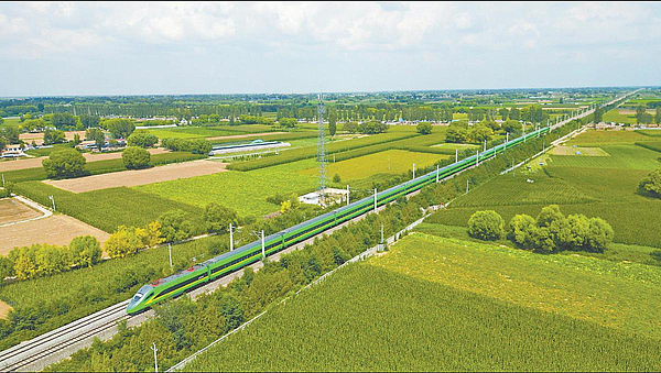 盛夏时节,从高空俯瞰,农业大镇东坑镇广袤的田野郁郁葱葱,宛如分割清晰的“绿色地毯”。绿色的复兴号动车组列车穿行其中,勾勒出一幅交通与田园风光交融、充满生机的乡村新画卷。