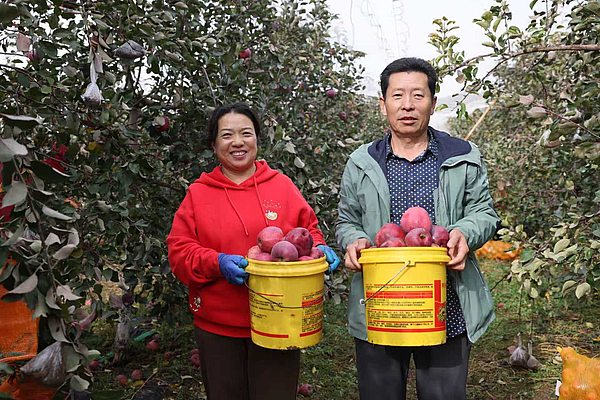 10月12日,种植大户王振忠的75亩“红色之爱”果园里,30多名村民忙着采摘苹果。“今年的收成特别好,树上的苹果春天就被客商预订了。”王振忠说。王振忠与“红色之爱”苹果的结缘,始于2017年的杨凌农高会。在农高会上,他被其独特品质吸引,先后4次前往种植基地考察,最终在2020年进行规模种植。经过4年的培育,今年,他家的果园进入了盛果期。今年,收购商给出的地头价为每公斤10.4元,这将给王振忠带来可观的收入。
