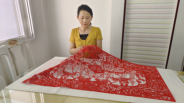 县级非遗传承人张倩的《非遗跑驴》,将国家级非遗靖边跑驴的表演场景定格红纸间,线条灵动、刻画鲜活,尽显靖边民间艺术的生命力;省级非遗传承人、陕西省工艺美术大师华月秀的《九月九》,融合重阳习俗与靖边剪纸镂空技艺,构图精巧、意境悠远,让传统节日文化焕发新生。两件作品均植根靖边本土,既延续了靖边剪纸质朴雄浑的艺术精髓,又紧扣民俗与节气文化,成为展现陕北非遗魅力的生动名片。