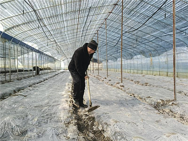 2月4日,张隆应在大棚内给羊肚菌除草。